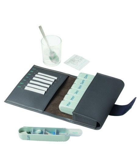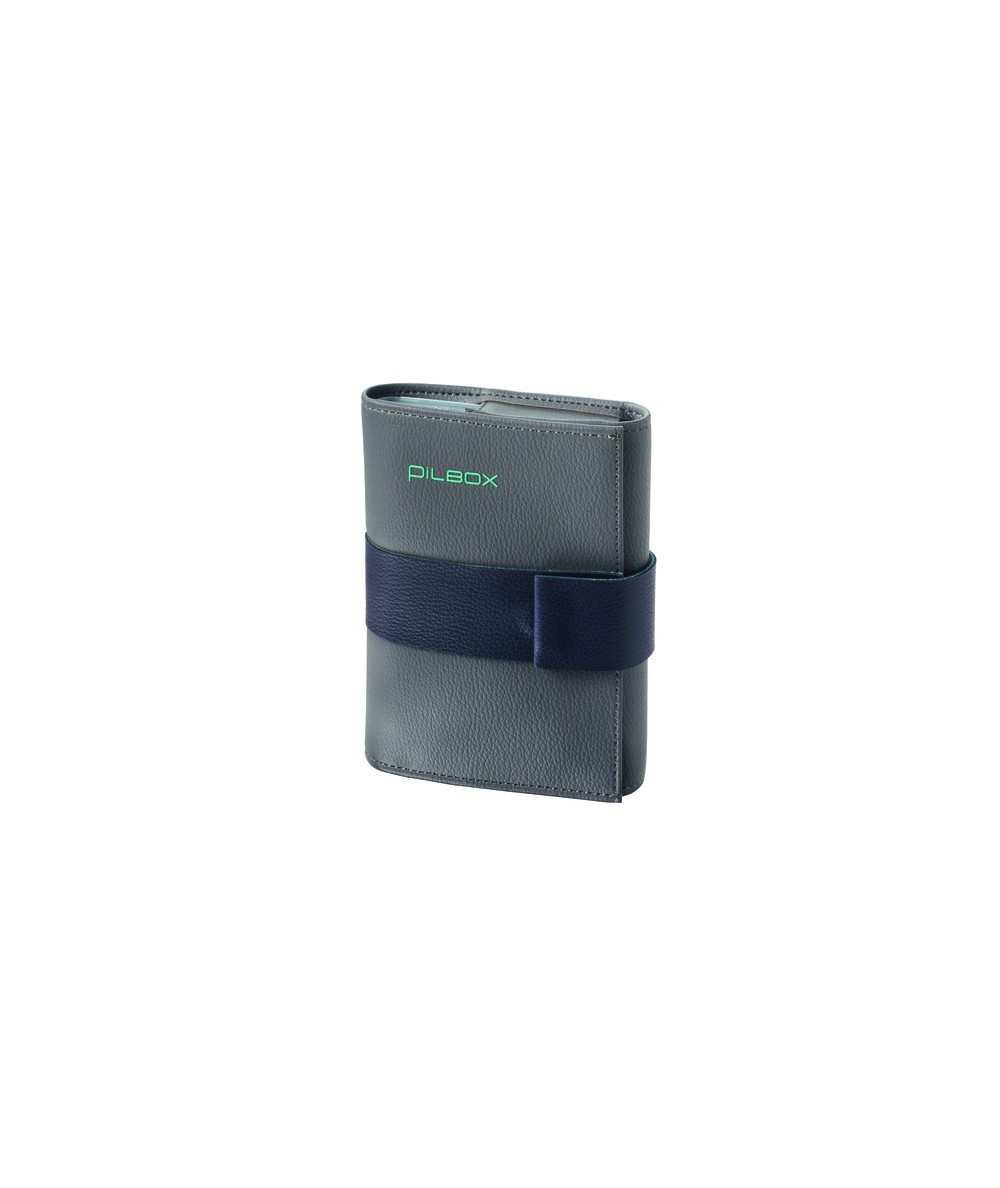 Pastillero semanal especial con espacio para una cajita por día. 7 módulos con 4 compartimentos en una elegante bolsa con solapa magnética. Color gris. Dimensiones: 15 x 12 x 3,5 cm.