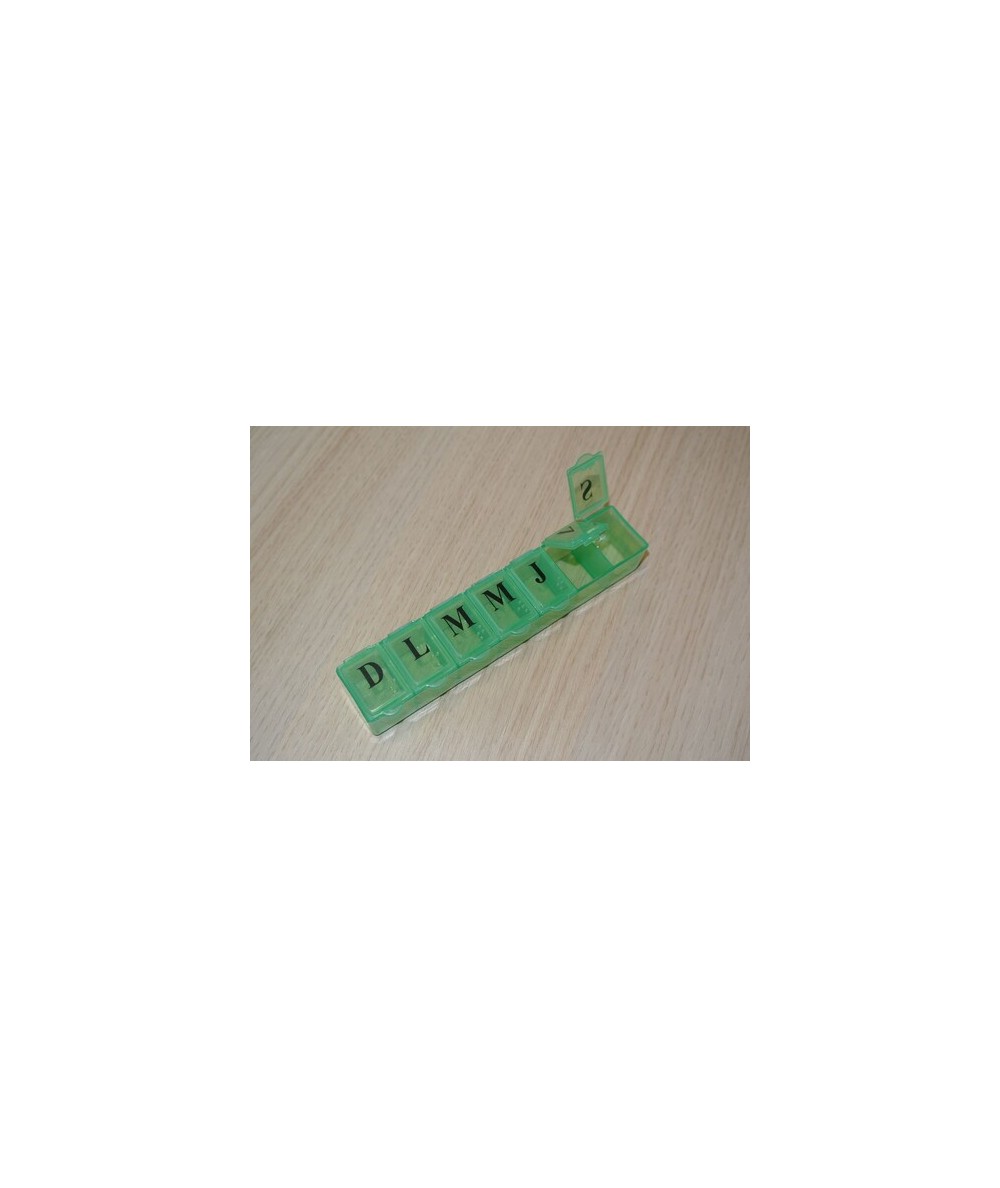 Pastillero pequeño para una semana completa de tratamiento, 7 cajas. Color verde. Dimensiones: 150 x 32 x 26 mm.