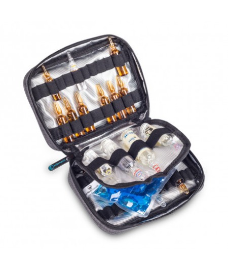 -Capacidad de ampollas: 24 pequeñas, 18 medianas. Dispone además de 7 gomas elásticas amplias en la solapa interna para ampollas más grandes.