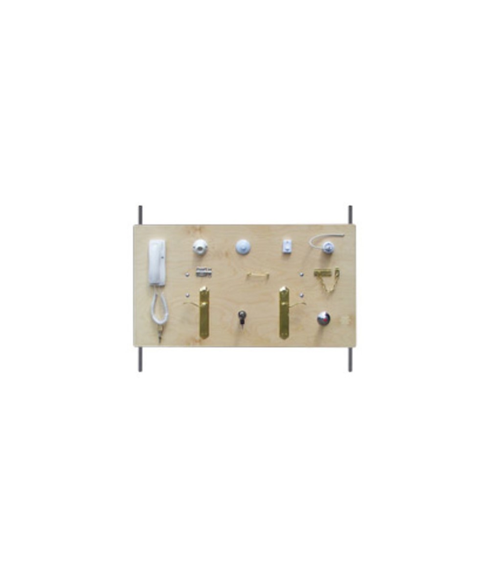 Tablero de madera barnizado natural y estructura de acero con acabado en epoxy con ruedas con freno diseñado para el entrenamiento de actividades básicas del día a día. Gracias a su regulación en altura, abarca todos los tipos de paciente posibles.