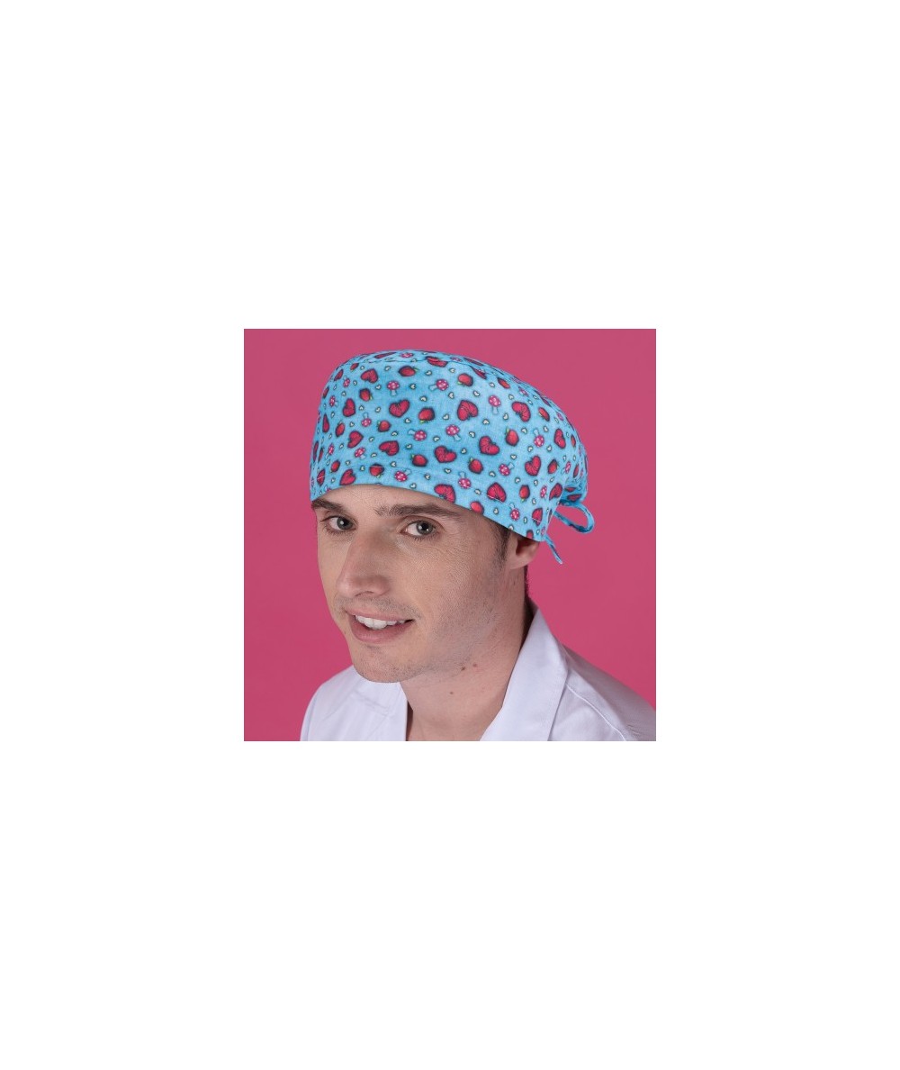 Gorro Quirófano pelo corto estampado de Corazones y setas con fondo azul claro.