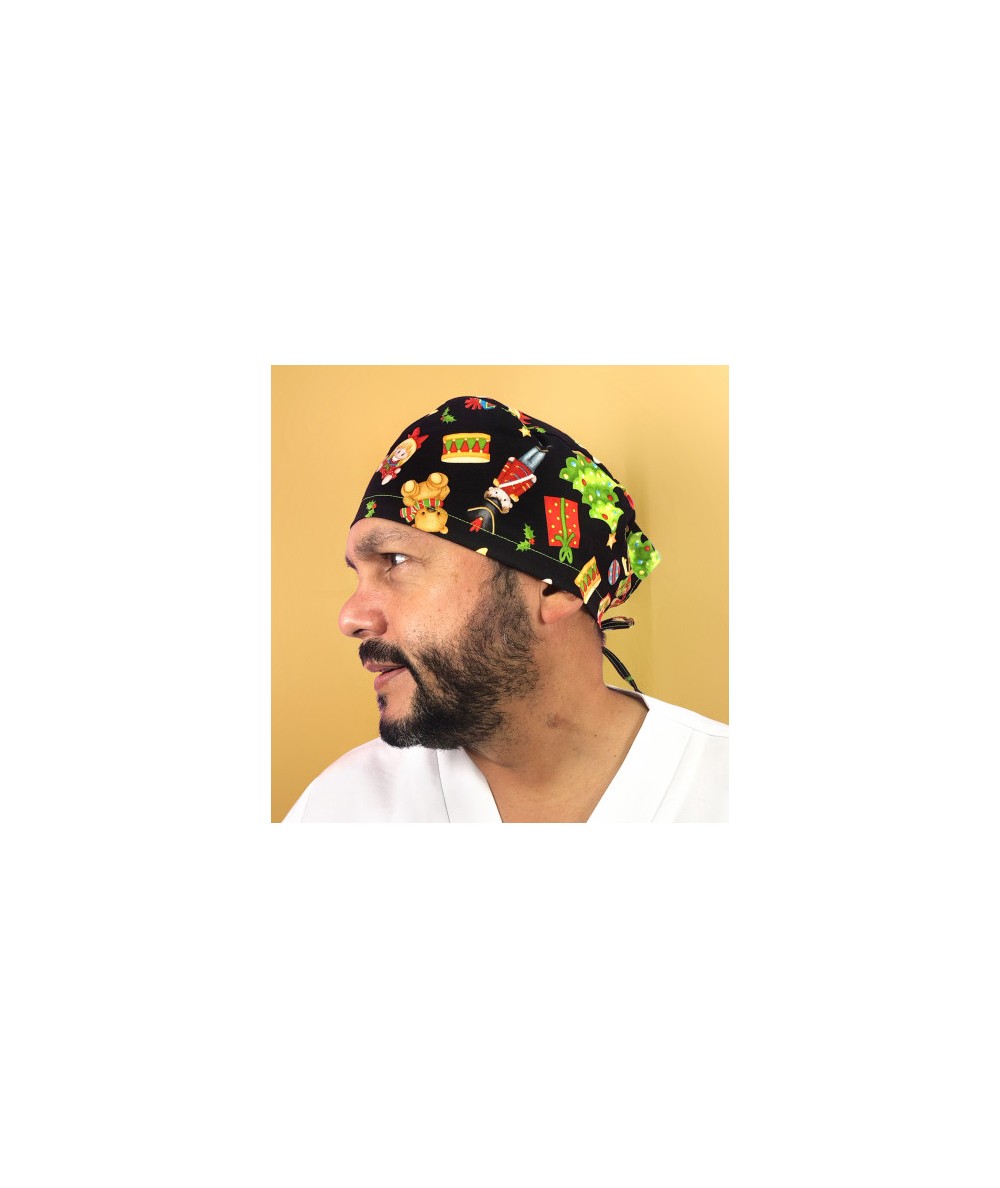 Gorro Quirófano pelo corto con cintas traseras estampado de Cuento de navidad en fondo negro.