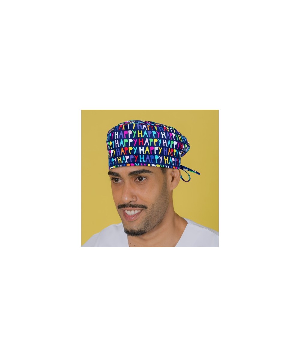 Gorro Quirófano Pelo Corto estampado palabra HAPPY en colores y fondo azul marino.