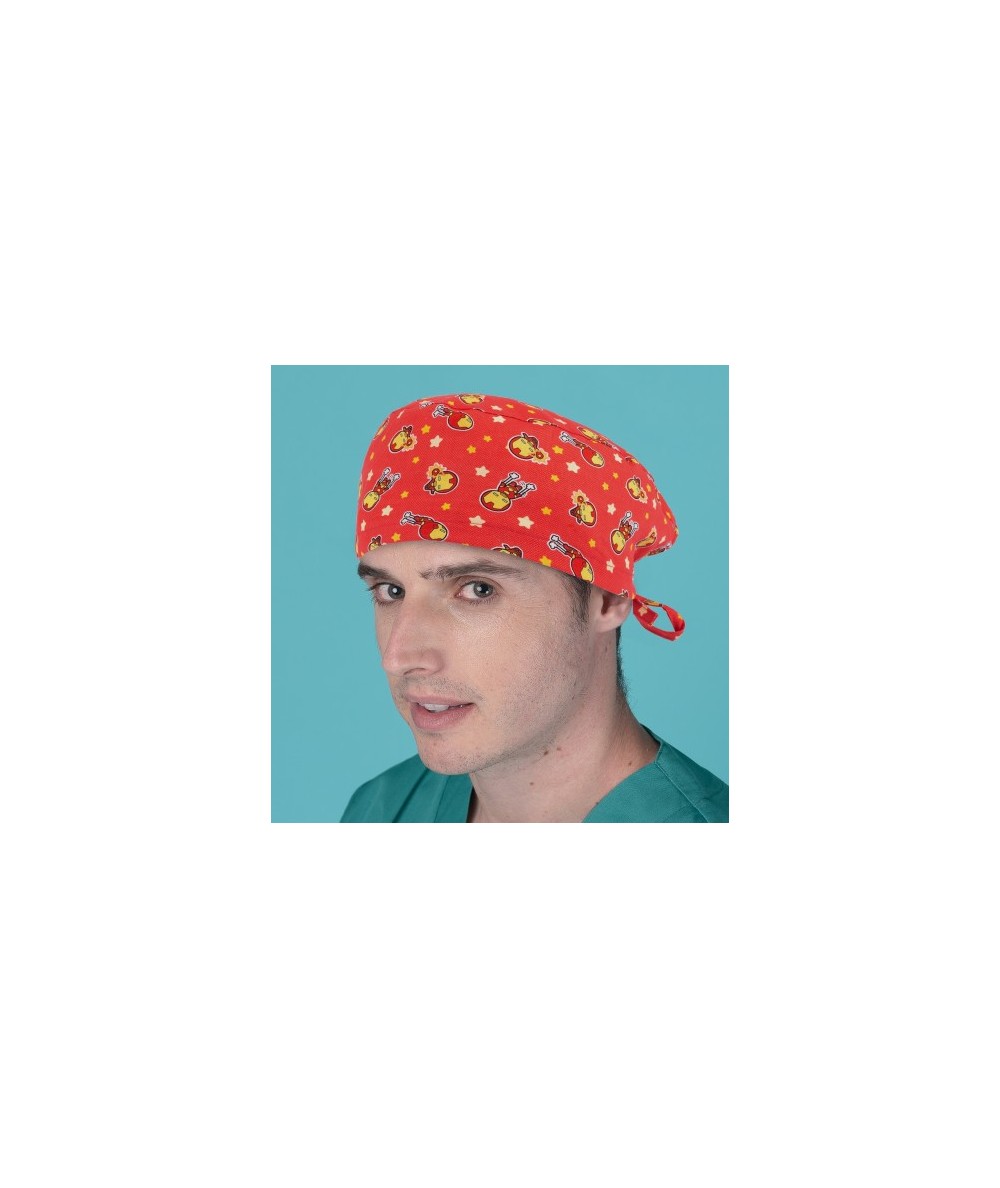 Gorro Quirófano pelo corto con cintas traseras estampado de superhéroe Ironman con fondo rojo.