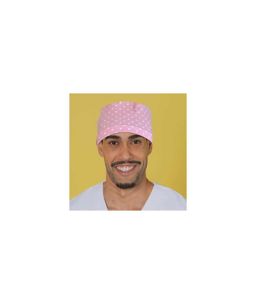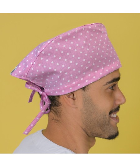 Gorro Quirófano pelo corto con cintas traseras estampado de Lunares con fondo rosa.