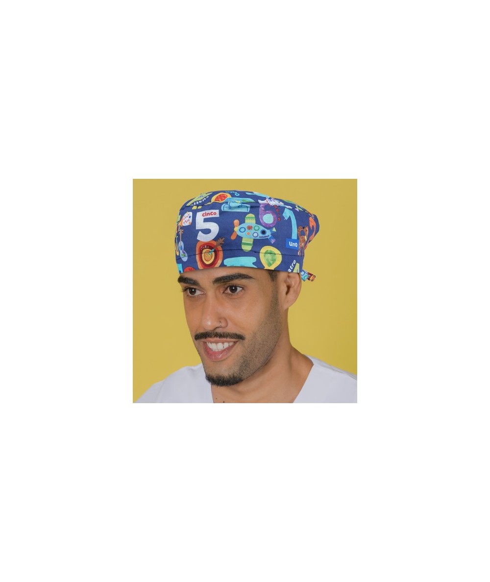 Gorro Quirófano Pelo Corto estampado de Números y colores en fondo azul.