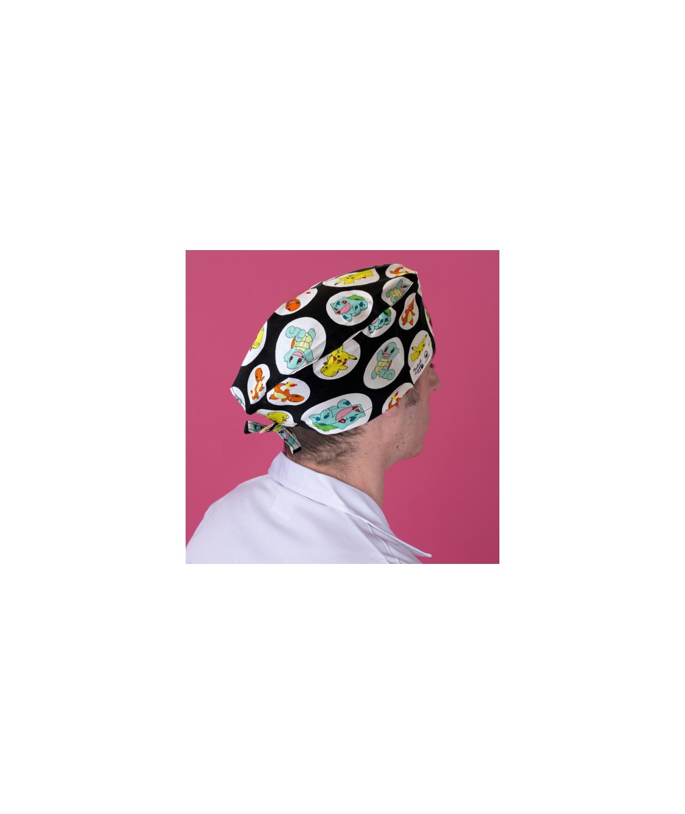 Gorro Quirófano pelo corto con cintas traseras estampado de Pokemon negro.