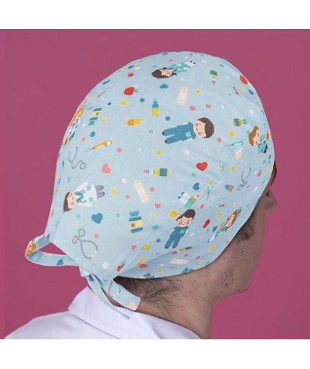 Gorro Quirófano pelo corto con cintas traseras estampado de sanitarios y material médico con fondo aguamarina.