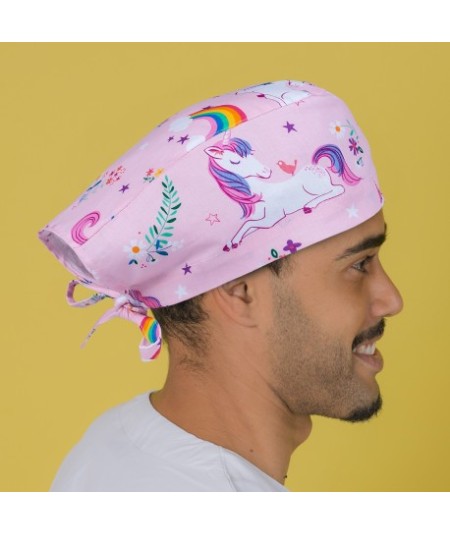 Gorro Quirófano Pelo Corto estampado de Unicornios y Arcoíris con fondo rosa.