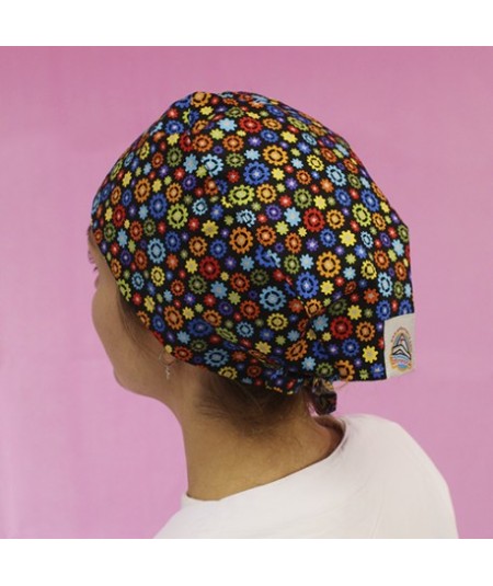 Gorro quirófano pelo corto con cintas traseras, estampado tuercas de colores en fondo negro.