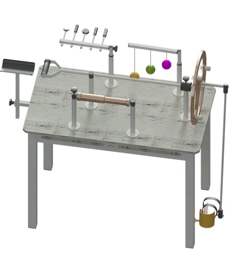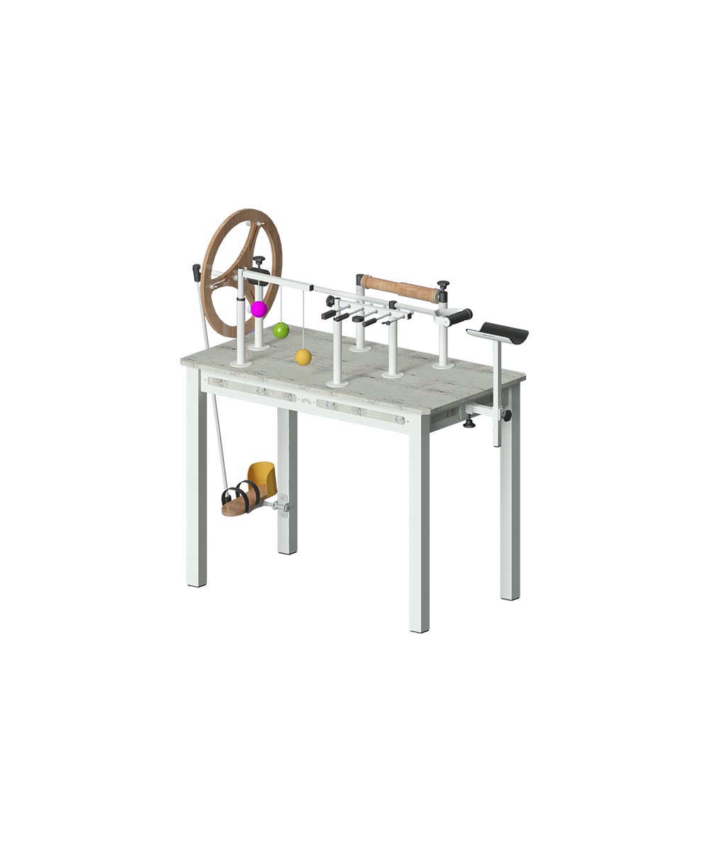 Estructura de acero con acabado en epoxy. Tablero de melamina. Complementos de madera barnizado natural, PLA y acero con acabado en epoxy. Todas nuestras mesas de ejercitación están diseñadas para su uso en distintas posturas y por varias personas a la vez. Patas terminadas en conteras antideslizantes.
