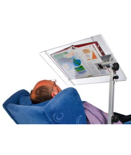 Atril mesa ergonómico regulable en inclinación y altura, con soporte para leer y escribir regulable de dos posiciones, y sobre con sistema doble de bloqueo de seguridad de la inclinación. Incorpora un tablero de metacrilato transparente que permite ver lo que hay detrás de el, resulta muy útil para personas en la cama que necesitan leer desde abajo. Base metálica pintada en color gris al fuego, regulable en inclinación y altura.
