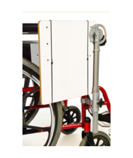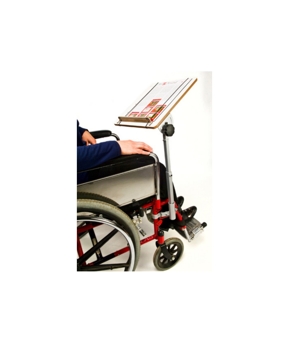 Ligero y resistente atril pala ergonómico, diseñado para silla de ruedas o de patas, regulable en inclinación y altura, con soporte para leer y escribir. Tablero de cantos romos y base metálica pintada al fuego en gris metalizado, se sujeta al tubo o la pata de la silla, si es tubular, mediante abrazadera. Se puede plegar quedando recogido.