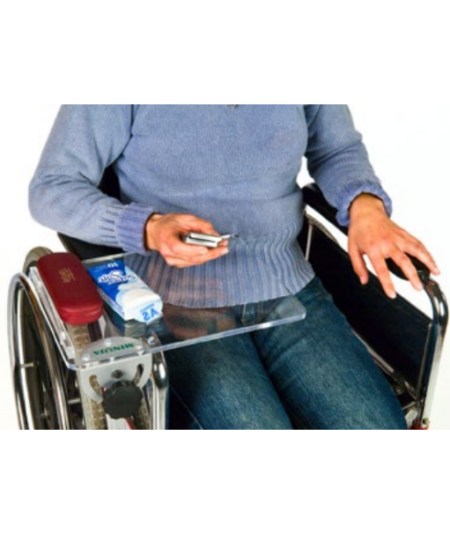 Ligero y resistente atril pala ergonómico, diseñado para silla de ruedas o de patas, regulable en inclinación y altura, con soporte para leer y escribir. Tablero de metacrilato con cantos romos y base metálica pintada al fuego en gris metalizado, se sujeta al tubo o la pata de la silla, si es tubular, mediante abrazadera. Se puede plegar quedando recogido.