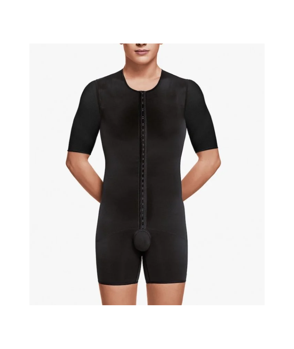 Body de hombre con mangas cortas para los postoperatorios de cirugía combinada de brazos, espalda, tórax, abdomen y glúteos. Apertura frontal con triple hilera de corchetes. Región urogenital abierta.