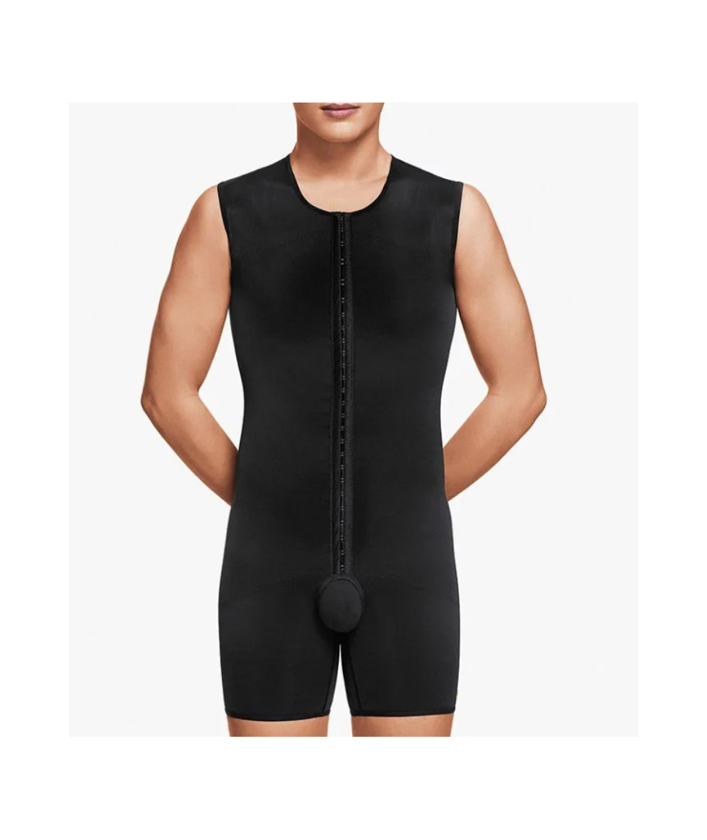 El body de hombre hasta rodilla de VOE, es una prenda de compresión especializada diseñada para la recuperación postoperatoria después de cirugías combinadas de pecho, abdomen y muslos.