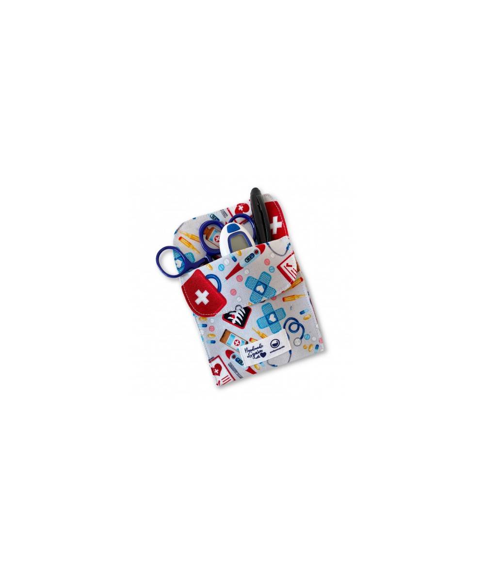 Protector de bolsillo de algodón estampado de instrumental con fondo gris.