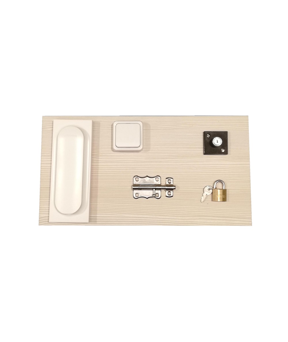 Tablero de melamina diseñado para el entrenamiento de actividades básicas del día a día. Diseñado para el uso individual. Puede utilizarse sentado, recostado o de pie, en una silla, en la cama o sobre una mesa.