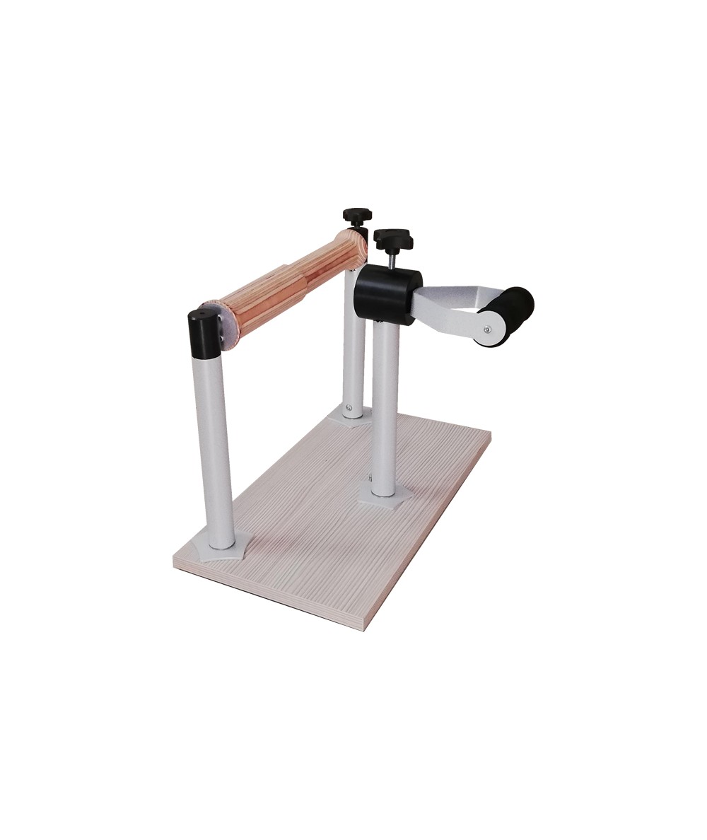 Tablero de melamina. Complementos de acero con acabado en epoxy. Flexo extensor de madera para un agarre más cálido. Diseñado para el uso individual. Tanto el flexo extensor como el prono supinador tienen mandos que permiten frenar el aparato con el fin de regular la fuerza con la que se ejercita la muñeca. Puede utilizarse sentado, recostado o de pie, en una silla, en la cama o sobre una mesa.