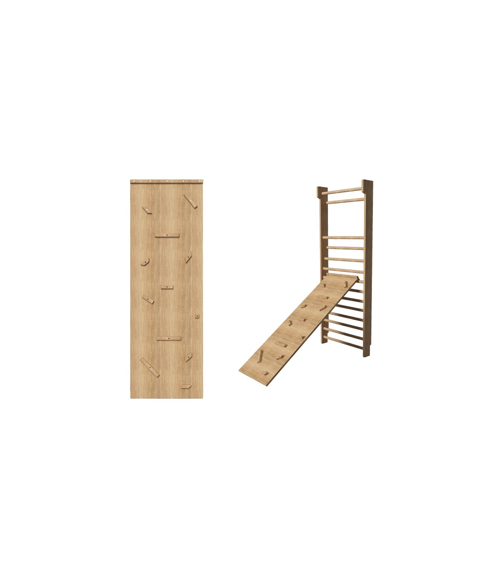 Fabricado en madera, barnizado natural. Se puede colocar sobre los tirantes de nuestras espalderas. Sobre una cara tiene distintas piezas de madera para ayudar a trepar, la otra está completamente libre de obstáculos. No usar con zapatos ni cremalleras ni otros objetos cortantes o punzantes. Soporta hasta 75kg.
