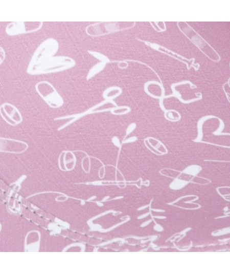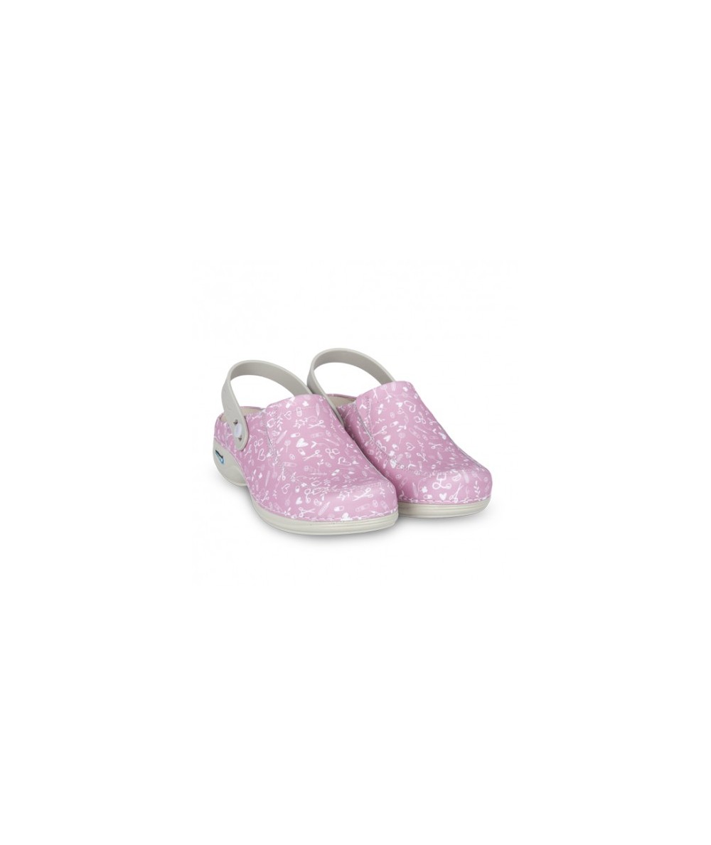 Zuecos sanitarios piel lavable, estampados con motivos sanitarios y fondo rosa.
