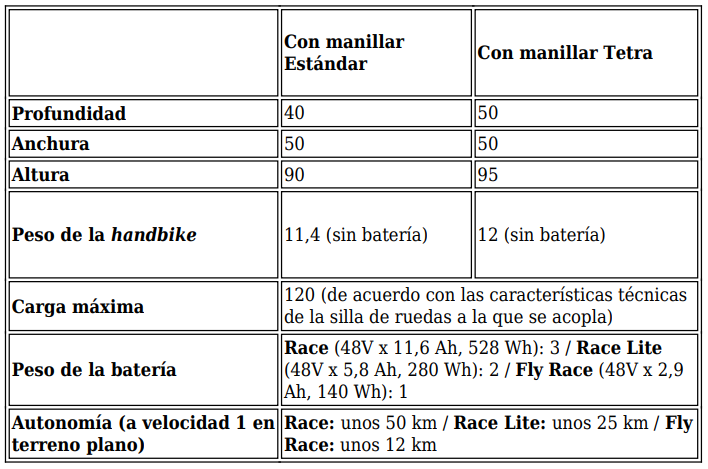 - Manillar disponible en dos versiones: Estándar y Tetra (para personas con tetraplejia: acelerador y freno activados mediante movimiento de empujar y tirar)
