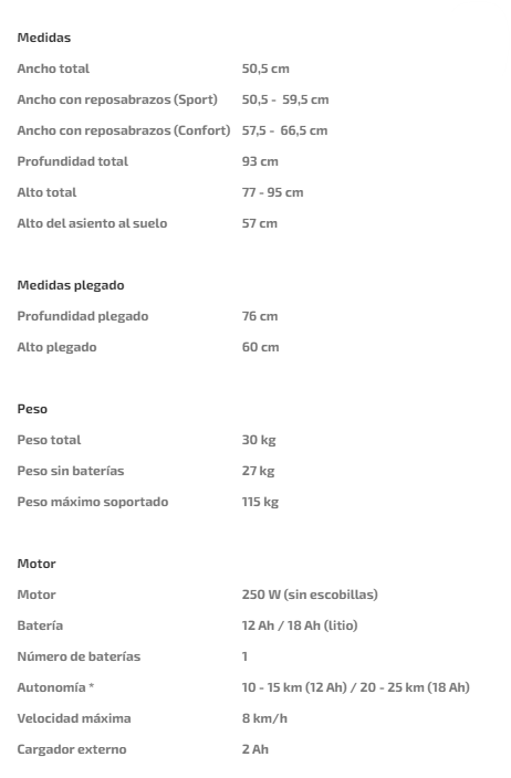 Cuenta con una batería de litio de 12 Ah o de 18 Ah que se puede cargar directamente desde el scooter o extraerla fácilmente para recargarla. Disponible el Bali Sport con reposabrazos abatibles y Bali Confort, este último trae de serie los reposabrazos abatibles y regulables en altura y anchura para mayor comodidad.