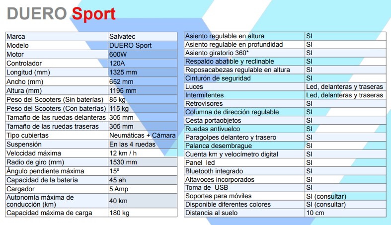 Con un diseño elegante, es un scooter de movilidad potente y resistente, capaz de transportar personas de hasta 180 kg. En este sentido, algunos usuarios llegan a pensar que su nivel de desplazamiento será reducido y lento con un scooter como el Duero Sport, pero ¡nada más lejos de la realidad! Con este scooter eléctrico de movilidad podrás ir a velocidades de hasta 12 Km/h con total seguridad.