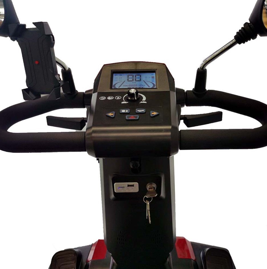 Su motor de 700W le permitirá alcanzar una velocidad máxima de hasta 15 km/h y sus dos baterías de 55Ah le proporcionarán una autonomía máxima de 50 kilómetros. Dispone de un sistema de freno electromagnético inteligente que junto a las luces e intermitentes delanteros y traseros LED garantizan una completa seguridad en su conducción, incluso nocturna.