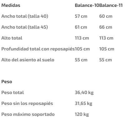 Está disponible con las ruedas macizas o hinchables. Las ruedas traseras están disponibles en 315 mm (Balance-10) y 550 mm (Balance-11) ambas opciones con freno tambor independiente. Disponible en talla 40 y 45 cm. Para completar su funcionalidad, esta silla de ruedas de acero ofrece accesorios opcionales como el taco abductor y los controles de tronco.
