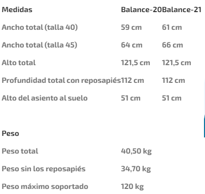 Los reposapiés ofrecen la posibilidad de ser regulados en altura y se pueden extraer y abatir. Los reposabrazos son extraíbles y regulables en altura y anchura. Su altura total es de 121,5 cm, el ancho total es de 59 cm y la profundidad con los reposapiés elevados es de 112 cm. Se puede escoger con las ruedas traseras de 315 mm (Balance-20) o 550 mm (Balance-21). Se puede añadir el taco abductor y los controles de tronco.