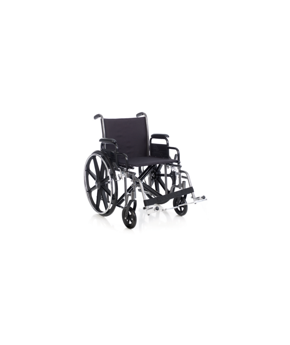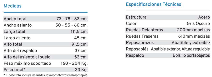 Silla de ruedas de acero bariátrica autopropulsable, plegable, con reposabrazos desmontables y reposapiés abatibles y extraíbles. Las ruedas delanteras y traseras son macizas. Tapicería de nylon, ignifuga y lavable.
