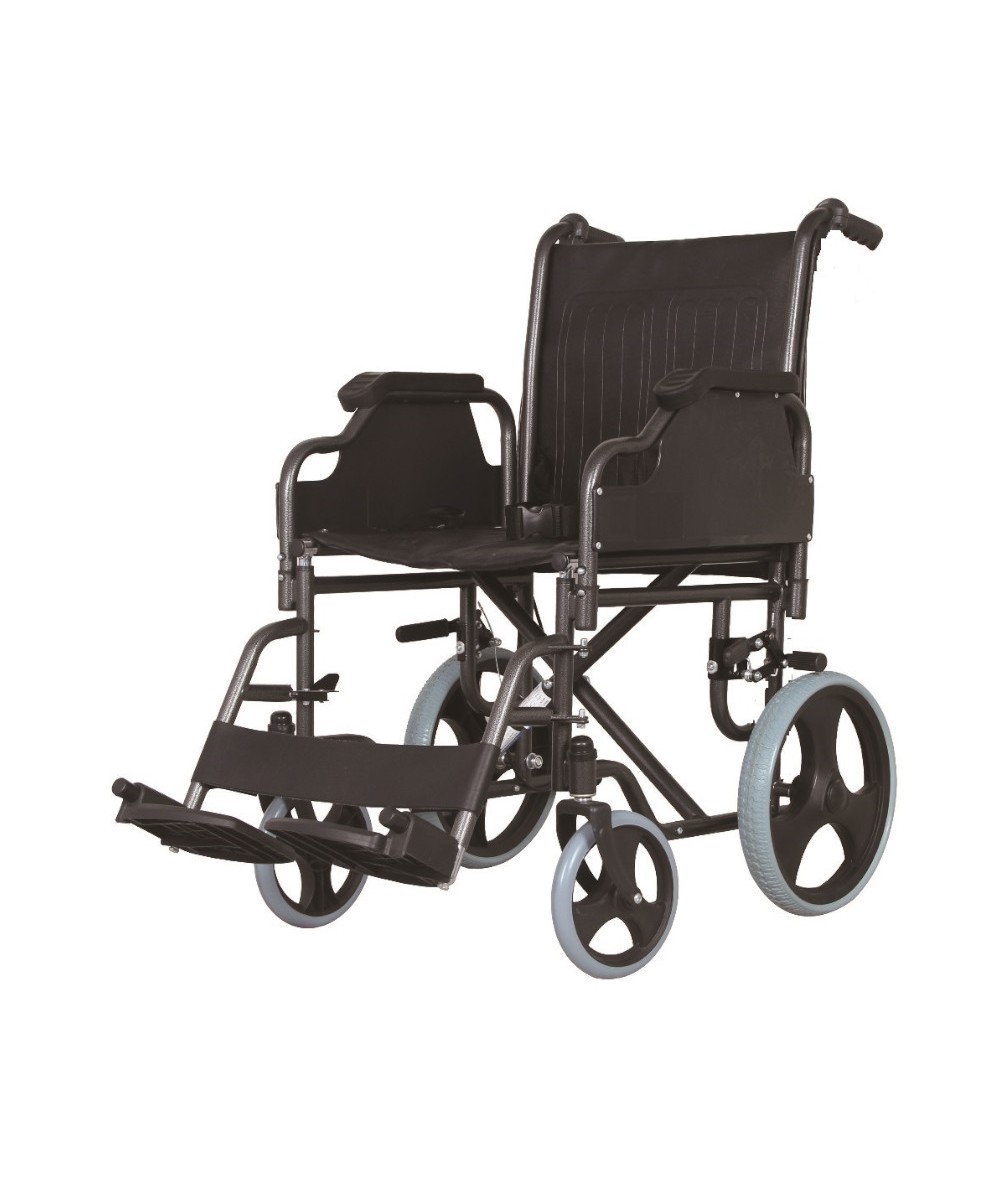 Esta silla de ruedas de transporte es muy cómoda y tiene gran capacidad de maniobra. El tamaño de sus ruedas permite que pueda utilizarse tanto en el interior como en el exterior. El usuario puede sentarse en ella para que lo trasladen utilizando las empuñaduras.