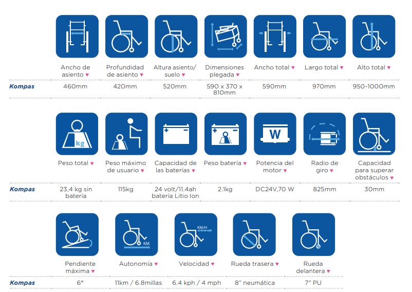 La silla de ruedas eléctrica plegable Kompas está equipada con una batería de litio de 11,4 Ah con puerto de carga adicional e indicador de batería que brinda una autonomía de 11km y puede viajar en avión. También como opción existe una batería de Litio 17.1 Ah para incrementar la autonomía a 18 Km. Por último, el sistema de frenado inteligente que previene automáticamente el movimiento involuntario mientras está parado, que bloquea de forma efectiva la silla en su lugar ofreciendo al usuario seguridad en todo momento.