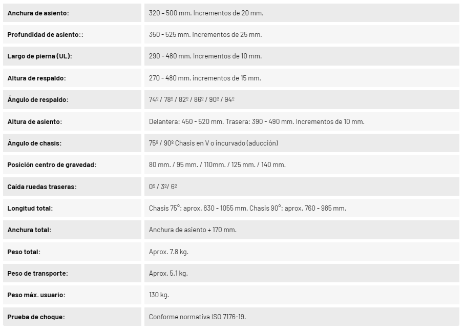 -Módulo de asiento: Consta de 5 posiciones de centro de gravedad para conseguir una posición más o menos activa.