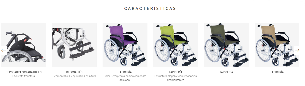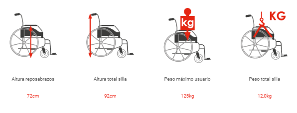 Otras opciones de color para tapicería: lila, pistón, verde oscuro y crema (costo adicional). Reposabrazos abatibles. Reposapiés ajustables en altura, abatibles y desmontables. Ruedas traseras de 600mm macizas, con llantas rayadas y con sistema de extracción rápida, para fácil transporte y almacenaje. Ruedas delanteras macizas de 200mm. Ancho del asiento: 400,430,460mm. Peso máximo de usuario: 125Kg.