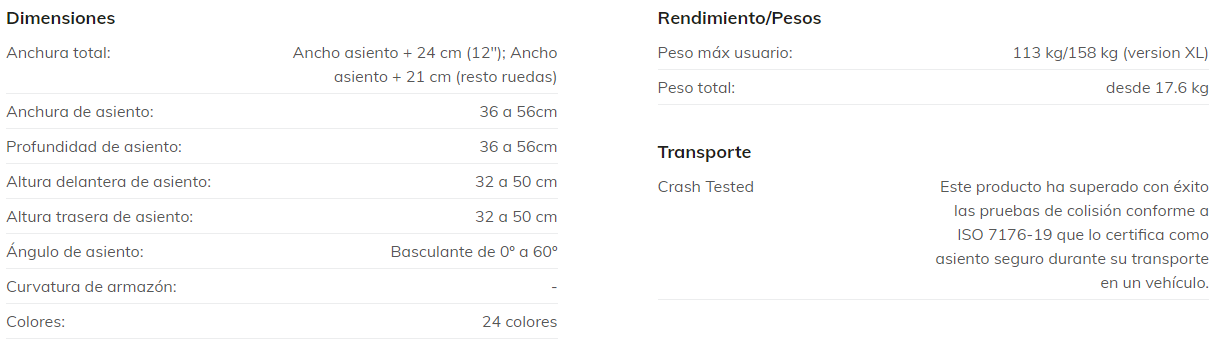 - Ancho asiento + 24 cm (12"); Ancho asiento + 21 cm (resto ruedas)