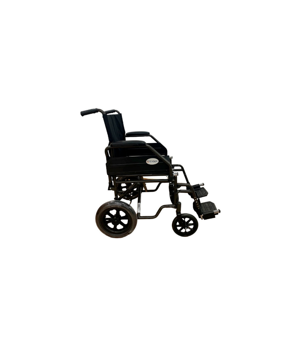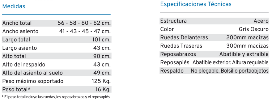Silla de ruedas de acero no autopropulsable, plegable con reposabrazos abatibles y extríbles. Reposapiés abatibles y regulables en altura. Ruedas traseras de extracción rápida. Tapicería de nylon, ignífuga y lavable.