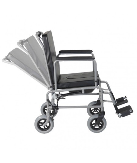 Nueva silla de ruedas con chasis rígido y respaldo reclinable con pistones de gas. Asiento y respaldo acolchados para un mayor confort y tapizados con material impermeables para facilitar la limpieza. Incorpora de serie una cubeta de gran capacidad . Los reposabrazos son extraíbles y las almohadillas están fabricadas con poliuretano de tacto suave. Ruedas de gran tamaño de 200x50 mm, lo que proporcionan la posibilidad de salir a exteriores y por sus reducidas dimensiones es apta para uso en interiores.