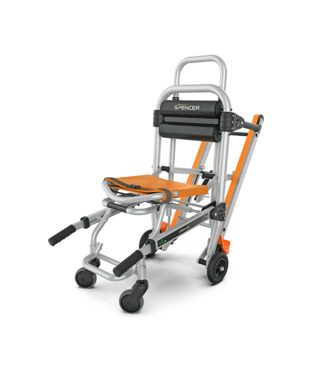 4Bell Stair+ es una silla de transporte y evacuación plegable, diseñada para trasladar o evacuar pacientes con limitaciones de movilidad desde edificios de varios pisos. Su sistema de oruga hace que la silla de evacuación y traslado sea adecuada para un descenso controlado de escaleras. Incluso, es posible que no sea necesario elevar la silla de evacuación y transporte 4Bell Stair +.