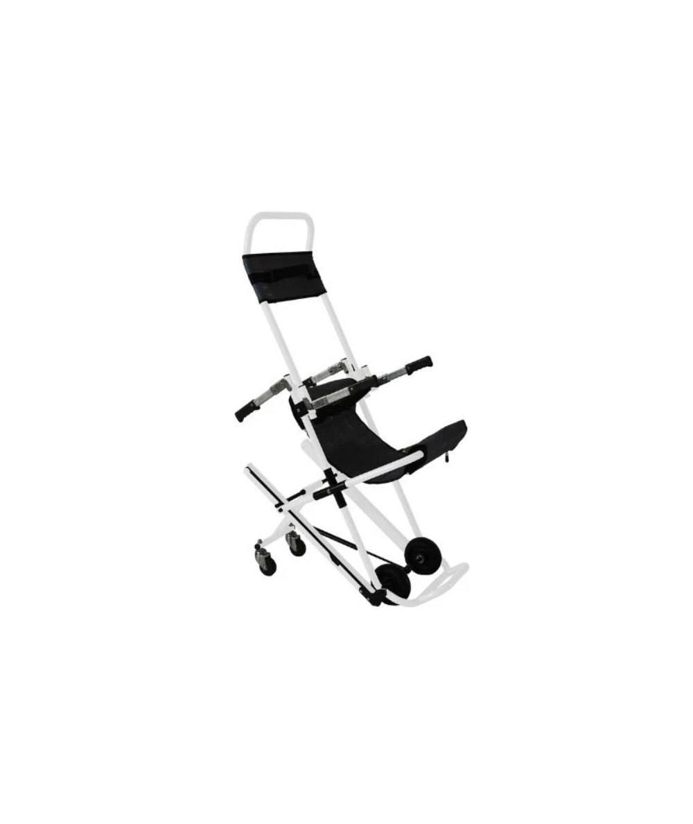La silla de evacuación PS-187 cuenta con sistema de oruga incorporado, lo que facilita la maniobra de subir y bajar escaleras. Está compuesta por una estructura tubular de aluminio ligero, pintada en color blanco y una lona acolchada negra, resistente y de fácil limpieza. Dispone de 4 empuñaduras plegables en la parte del respaldo para facilitar su manejo en escaleras y un apoyapiés tubular para el paciente. Tiene un rápido sistema de plegado y una gran maniobrabilidad gracias a sus 4 ruedas.