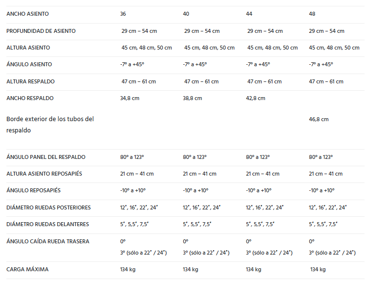 - Ancho del asiento disponible en 4 medidas: 36 cm, 40 cm, 44 cm y 48 cm.