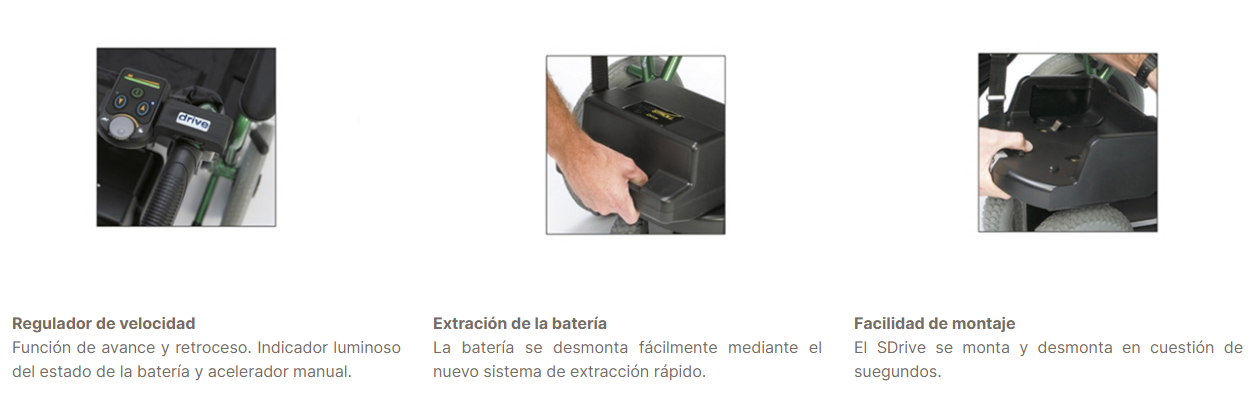 Sistema electrónico para el acompañante de sillas de ruedas manuales. S-Drive se coloca directamente a las sillas de ruedas manuales y ayuda al cuidador a realizar la operación de empujar la silla. Dispone de marcha hacia delante y hacia atrás. Desmontable en segundos y fácil de usar, se adapta a la mayoría de las sillas de ruedas del mercado.