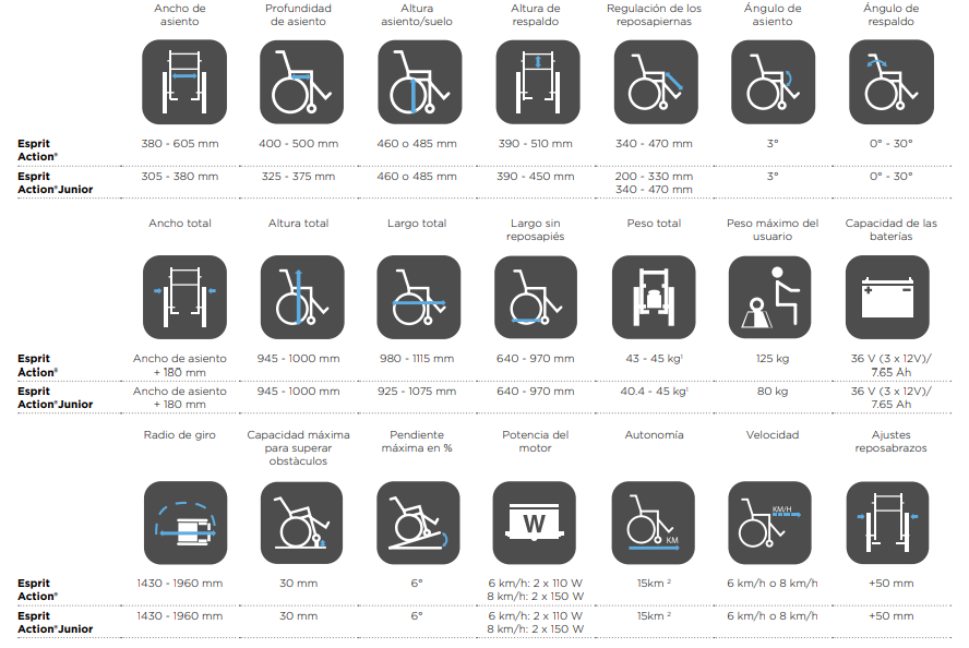La nueva Esprit Action® Junior, es la silla de ruedas electrónica plegable y multiajustable de referencia para los más pequeños. La Esprit Action® Junior ahora cuenta con más tecnología que nunca, como un giroscopio que permite reducir la batalla de la silla y conseguir una maniobrabilidad optimizada y una conducción más precisa sobre todo en rampas.